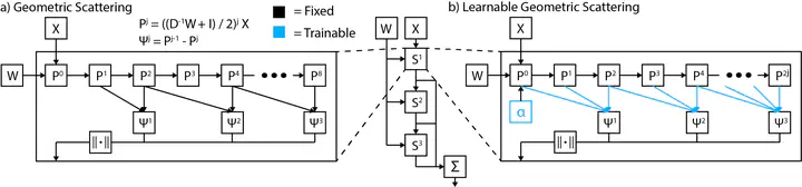 Trainable parameters for the learnable geometric scattering networkGraph neural networks (GNNs) in general, and graph convolutional networks (GCN) in particular, often rely on low-pass graph filters to incorporate geometric information in the form of local smoothness over neighboring nodes. While this approach performs well on a surprising number of standard benchmarks, the efficacy of such models does not translate consistently to more complex domains, such as graph data in the biochemistry domain. We argue that these more complex domains require priors that encourage learning of band-pass and high-pass features rather than oversmoothed signals of standard GCN architectures. Here, we propose an alternative GNN architecture, based on a relaxation of recently proposed geometric scattering transforms, which consists of a cascade of graph wavelet filters. Our learned geometric scattering (LEGS) architecture adaptively tunes these wavelets and their scales to encourage band-pass features to emerge in learned representations. This results in a simplified GNN with significantly fewer learned parameters compared to competing methods. We demonstrate the predictive performance of our method on several biochemistry graph classification benchmarks, as well as the descriptive quality of its learned features in biochemical graph data exploration tasks. Our results show that the proposed LEGS network matches or outperforms popular GNNs, as well as the original geometric scattering construction, while also retaining certain mathematical properties of its handcrafted (nonlearned) design.